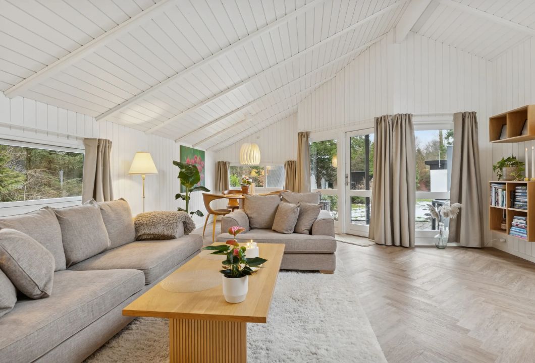 Loft til kip, der bidrager til luft og lys, og de store vinduespartier lukker naturen helt tæt på. Her er plads til både at komme ned i gear samt fællesskab - uanset om det er lange morgenstunder, brætspilseftermiddage eller rolige aftener foran pilleovnen.