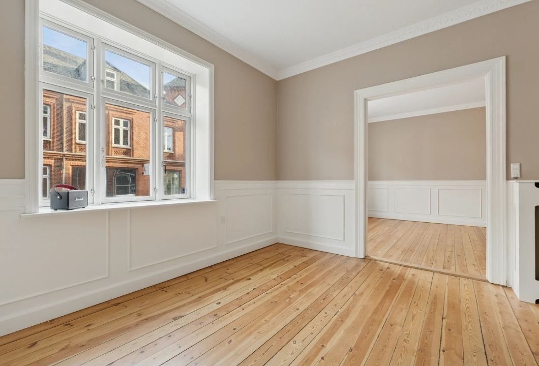 Lejligheden byder på hele to stuer, der med deres smukke stuklofter og høje paneler skaber en atmosfære af klassisk luksus. Her er der plads til både sofahygge, middagsgæster og hjemmearbejde – og måske endda et lille hyggeligt bibliotekshjørne, hvis du drømmer om det.